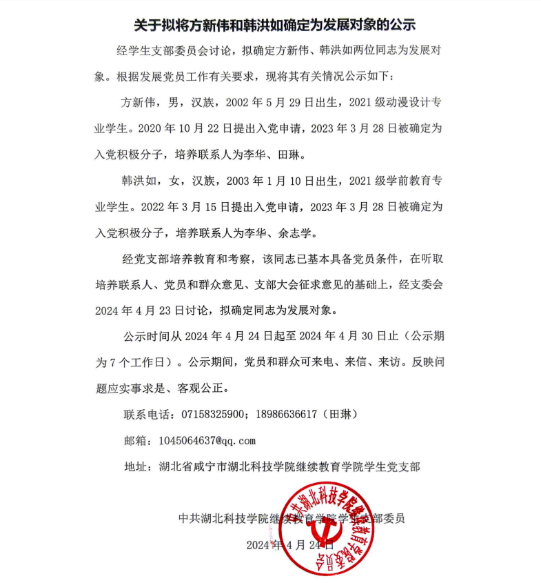 jinnianhui金年会诚信至上学生支部关于拟将方新伟和韩洪如确定为发展对象的公示