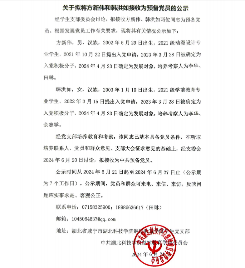 jinnianhui金年会诚信至上学生支部关于拟将方新伟和韩洪如接收为预备党员的公示